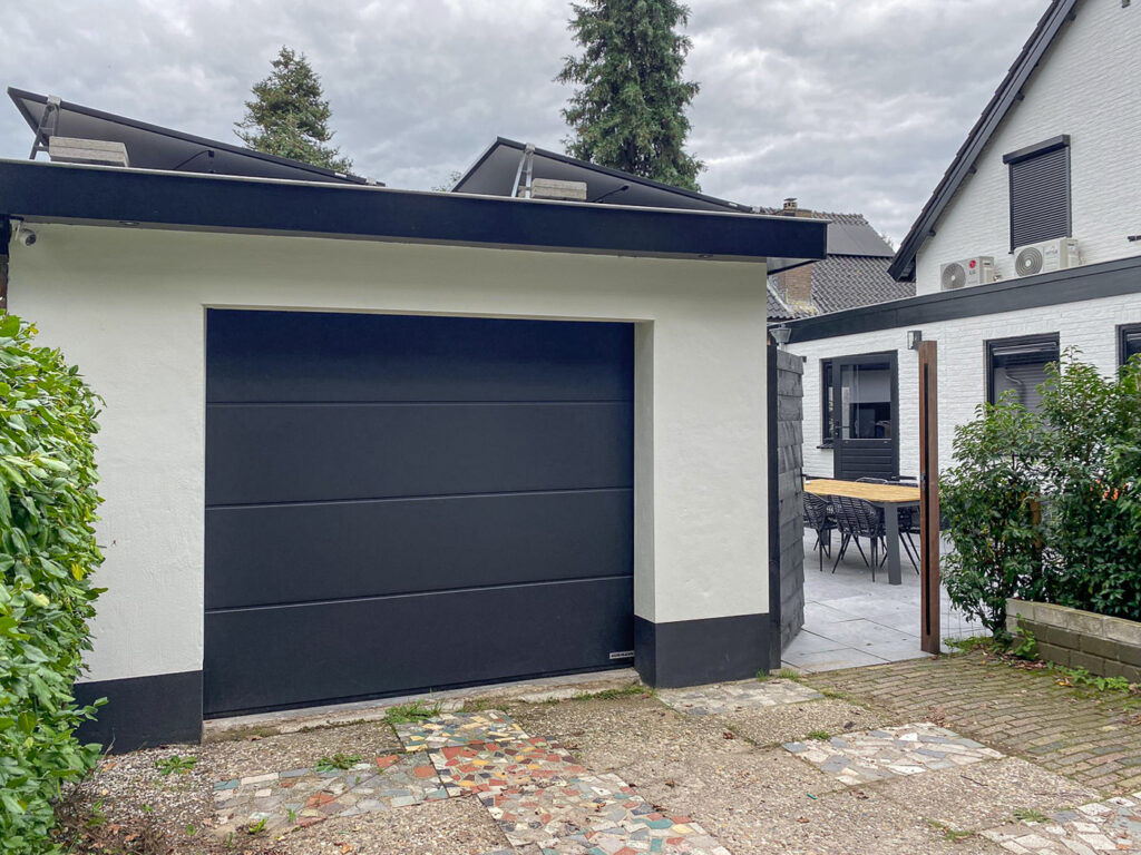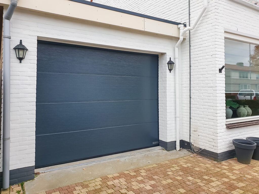 Een strakke garagedeur met grote paneelverdeling en een eigentijdse, matte look.